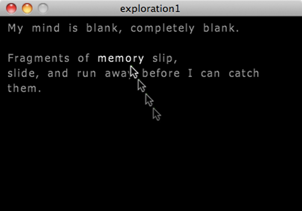 This project explored the ways that the design of interactivity in games and interactive art can be used to create an aesthetic response in the user. The aim of the project was to investigate the various structural “devices”, equivalent to literary devices such as imagery, allusion, and choice of language, which can be used by designers of interactive media to “slow down” the process of perception while interacting with an interactive work, to create a poetic effect similar to the effect of poetic or literary language on a reader of a literary work.